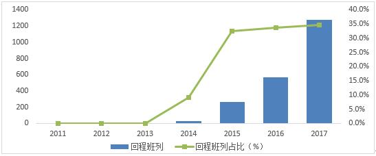 圖7 中歐班列回程班列開行統(tǒng)計(2011年-2017年)
