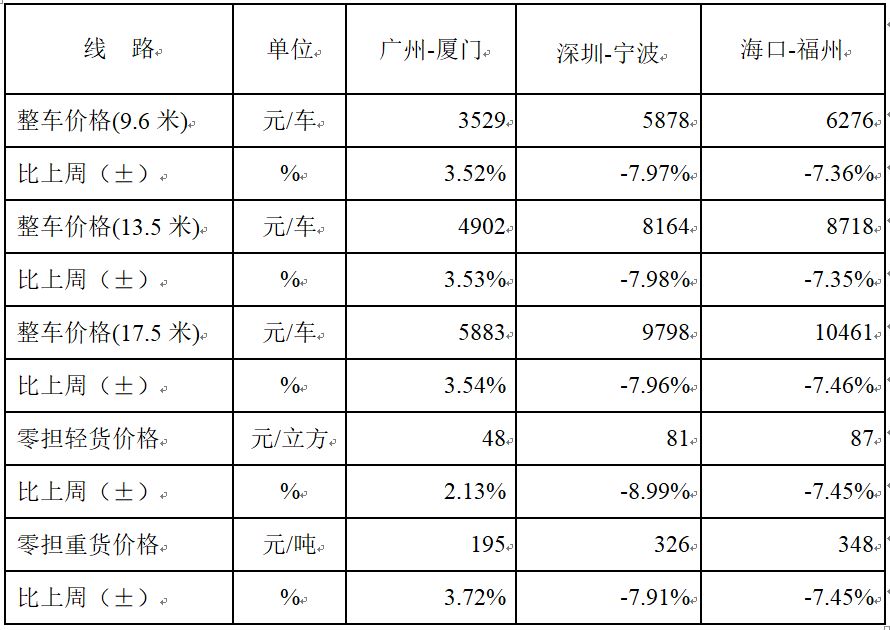 各車型指有不同程度回落,其中整車指數環比回落幅度低于零擔指數。其中,整車指數為950.點,比上周回落4.86%;零擔輕貨指數回落幅度略高于零擔重貨指數。零擔重貨指數為948.94點,環比回落4.86%;零擔輕貨指數為947.55點,環比回落7.23%。