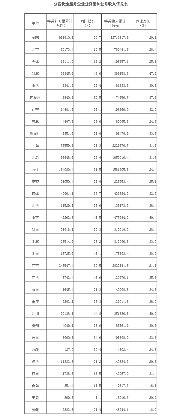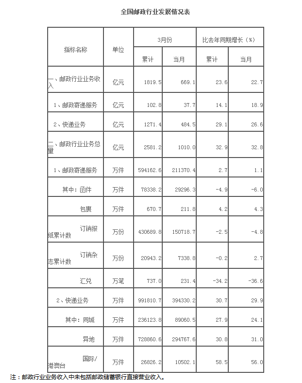 一季度,郵政行業(yè)業(yè)務(wù)收入(不包括郵政儲(chǔ)蓄銀行直接營業(yè)收入)累計(jì)完成1819.5億元,同比增長23.6%;業(yè)務(wù)總量累計(jì)完成2581.2億元,同比增長32.9%。