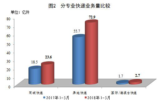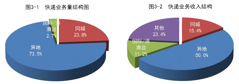 一季度,同城、異地、國際/港澳臺(tái)快遞業(yè)務(wù)量分別占全部快遞業(yè)務(wù)量的23.8%、73.5%和2.7%;業(yè)務(wù)收入分別占全部快遞收入的15.4%、50%和11.2%。與去年同期相比,同城快遞業(yè)務(wù)量的比重下降0.5個(gè)百分點(diǎn),異地快遞業(yè)務(wù)量的比重基本持平,國際/港澳臺(tái)業(yè)務(wù)量的比重上升0.5個(gè)百分點(diǎn)。