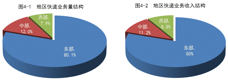 一季度,東、中、西部地區(qū)快遞業(yè)務(wù)量比重分別為80.1%、12%和7.9%,業(yè)務(wù)收入比重分別為80%、11.2%和8.8%。與去年同期相比,東部地區(qū)快遞業(yè)務(wù)量比重下降0.4個(gè)百分點(diǎn), 快遞業(yè)務(wù)收入比重下降0.6個(gè)百分點(diǎn);中部地區(qū)快遞業(yè)務(wù)量比重基本持平, 快遞業(yè)務(wù)收入比重上升0.2個(gè)百分點(diǎn);西部地區(qū)快遞業(yè)務(wù)量比重上升0.4個(gè)百分點(diǎn),快遞業(yè)務(wù)收入比重上升0.4個(gè)百分點(diǎn)。