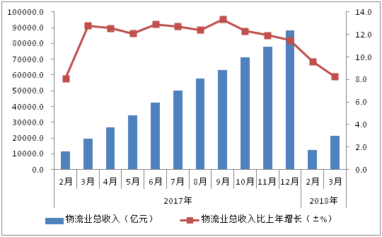 圖 3 2017-2018年物流業(yè)總收入及增長