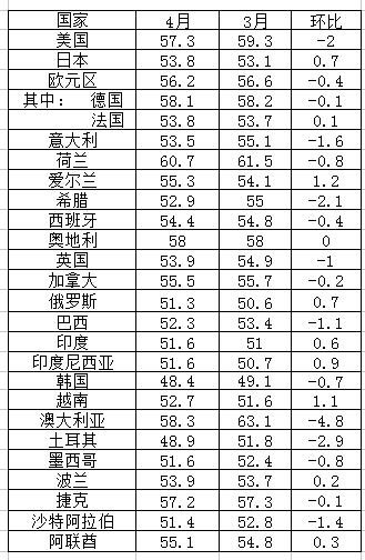 2018年4月全球主要國家和地區制造業PMI指數表