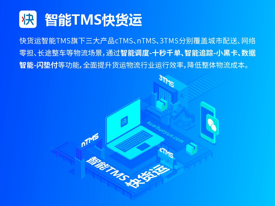 小快科技是從SaaS TMS業務起家的。我們有一個智能TMS的品牌"快貨運",有cTMS(City)、3TMS(3PL)、nTMS(Network)三套產品,分別覆蓋同城、三方、網絡零擔三種物流運輸業態。通過智能調度、智能追蹤、數據智能等差異化特性,幫助貨主企業與承運單元更好的實現物流運輸的數字化管理,提升物流運作效率。現在服務的客戶包括阿里、京東、普洛斯、德邦等布局的三方與倉配業務,跟各個省的區域零擔小霸王也都有業務合作。