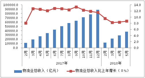 進(jìn)入5月,物流市場(chǎng)環(huán)境和供需連續(xù)回升,物流業(yè)收入規(guī)模保持增勢(shì),且增長(zhǎng)較前期有所加快。1-5月物流業(yè)總收入為3.7萬(wàn)億元,同比增長(zhǎng)8.7%,增速比1-4月提高0.3個(gè)百分點(diǎn)。