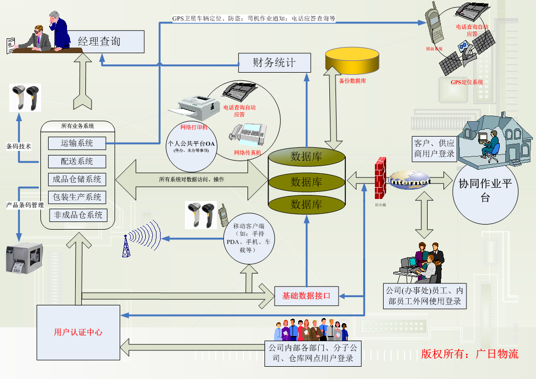 廣日物流綜合信息系統(tǒng)擁有集中式管理的中心數(shù)據(jù)庫,提供用戶統(tǒng)一登陸認(rèn)證中心,根據(jù)用戶預(yù)設(shè)的權(quán)限獲得相關(guān)的功能及操作權(quán)限。