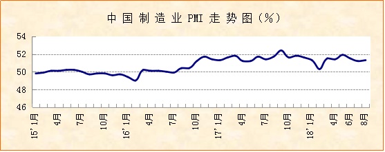 中國物流與采購聯合會、國家統計局服務業調查中心發布的2018年8月份中國制造業采購經理指數(PMI)為51.3%,較上月小幅回升0.1個百分點,連續25個月位于榮枯線以上,顯示經濟增長趨勢穩定。從主要分項指數來看,生產量指數、從業人員指數、生產經營活動預期指數等環比上升,表明制造業在“穩就業、穩預期”方面取得了一定成果,經濟短期下行壓力有所緩解。值得關注的是,本月PMI回升偏弱,新訂單指數等主要分項指數低于去年同期水平,購進價格指數和出廠價格指數間的差距有所擴大,產成品庫存指數有所上升。
