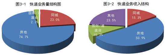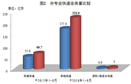 1-8月,同城、異地、國際/港澳臺(tái)快遞業(yè)務(wù)量分別占全部快遞業(yè)務(wù)量的23%、74.7%和2.3%;業(yè)務(wù)收入分別占全部快遞收入的15.3%、50.9%和10.3%。與去年同期相比,同城快遞業(yè)務(wù)量的比重下降0.4個(gè)百分點(diǎn),異地快遞業(yè)務(wù)量的比重上升0.2個(gè)百分點(diǎn),國際/港澳臺(tái)業(yè)務(wù)量的比重上升0.2個(gè)百分點(diǎn)。
