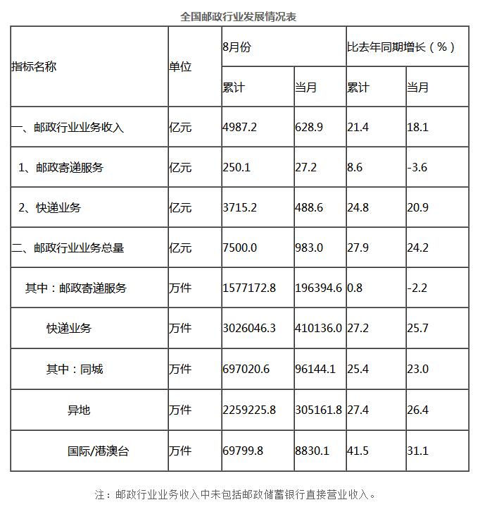 1-8月份,郵政行業(yè)業(yè)務(wù)收入(不包括郵政儲(chǔ)蓄銀行直接營業(yè)收入)累計(jì)完成4987.2億元,同比增長(zhǎng)21.4%;業(yè)務(wù)總量累計(jì)完成7500億元,同比增長(zhǎng)27.9%。