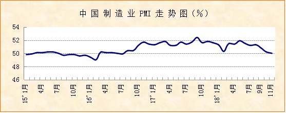 中國物流與采購聯合會、國家統計局服務業調查中心發布的2018年11月份中國制造業采購經理指數(PMI)為50%,環比下降0.2個百分點,落至榮枯線水平,顯示下行壓力仍不容忽視。細分指數顯示,當前國內供需小幅下降,原材料價格和產成品價格明顯回落。但總的來看,供需保持在擴張區間,大中型企業生產經營形勢相對平穩,穩中有進態勢繼續發展,新舊動能轉換加快,制造業后期走勢具有回穩基礎。