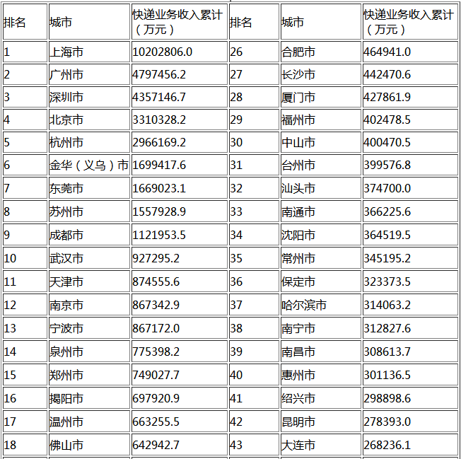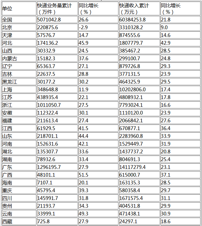 12月份,全國快遞服務企業業務量完成54.2億件,同比增長29%;業務收入完成609.6億元,同比增長17.3%。
