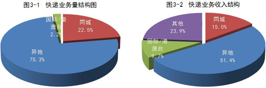 2018年,同城、異地、國際/港澳臺快遞業務量分別占全部快遞業務量的22.5%、75.3%和2.2%;業務收入分別占全部快遞收入的15%、51.4%和9.7%。與去年同期相比,同城快遞業務量的比重下降0.6個百分點,異地快遞業務量的比重上升0.5個百分點,國際/港澳臺業務量的比重上升0.1個百分點。
