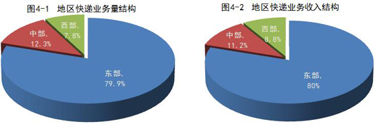 2018年,東、中、西部地區快遞業務量比重分別為79.9%、12.3%和7.8%,業務收入比重分別為80%、11.2%和8.8%。與去年同期相比,東部地區快遞業務量比重下降1.2個百分點, 快遞業務收入比重下降0.9個百分點;中部地區快遞業務量比重上升0.7百分點, 快遞業務收入比重上升0.4個百分點;西部地區快遞業務量比重和快遞業務收入比重均上升0.5個百分點。