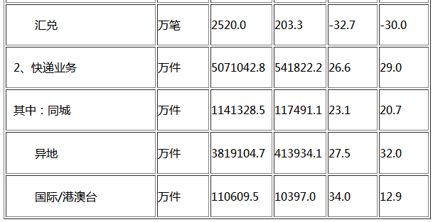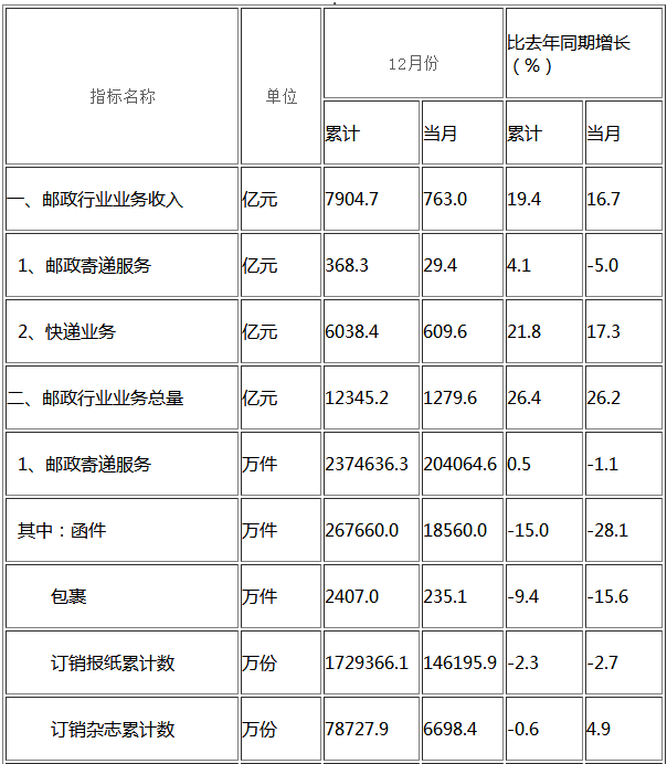 12月份,郵政服務業務總量完成186.5億元,同比增長17.2%;郵政寄遞服務業務量完成20.4億件,同比下降1.1%;郵政寄遞服務業務收入完成29.4億元,同比下降5%。