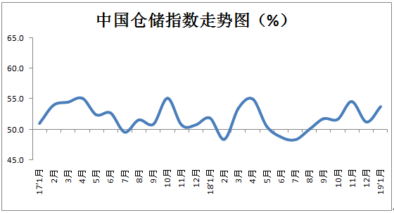 中國物流與采購聯合會發布的2019年1月份中國物流業景氣指數為53.7%較上月回落1個百分點;中國倉儲指數為53.7%,較上月回升2.5個百分點。