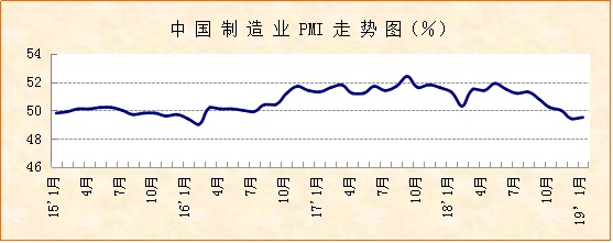 中國物流與采購聯合會、國家統計局服務業調查中心發布的2019年1月份中國制造業采購經理指數(PMI)為49.5%,較上月回升0.1個百分點。從分項指數來看,多數指數穩中有升,顯示供需增速相對穩定,產成品庫存繼續減少,價格下降勢頭趨緩,經濟運行呈趨穩跡象。