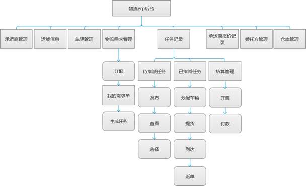 信息流管理平臺TMS模塊結構圖如下所示,分為承運商管理、運能信息、車輛管理、物流需求管理、任務記錄、承運商報價記錄、委托方管理、倉庫管理等部分: