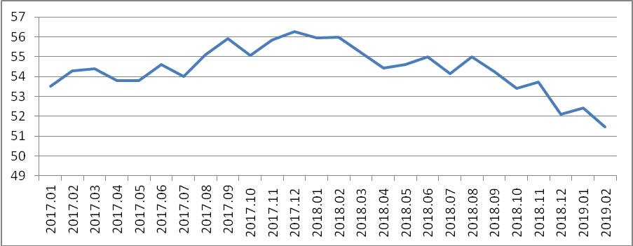 據中國物流與采購聯合會發布,2019年2月份全球制造業PMI為51.5%,較上月回落0.9個百分點,較去年同期下降4.5個百分點。美國制造業增速放緩及歐洲制造業持續下滑導致全球制造業增速放緩。全球制造業PMI自2018年8月以來呈現波動回落趨勢,本月創出近兩年新低,意味著全球經濟復蘇呈現逐步放緩趨勢,下行壓力有所顯現。
