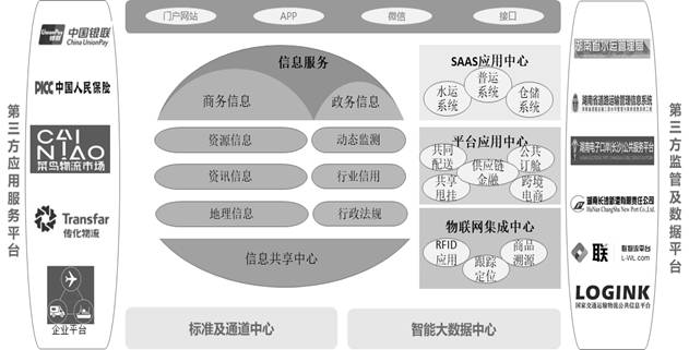 物流公共信息服務平臺是一個有機體,以標準和通道中心、智能大數據中心建設為主體。并以這兩大中心作為其他應用服務的基礎性支撐,發揮公共平臺巨大整合效應。