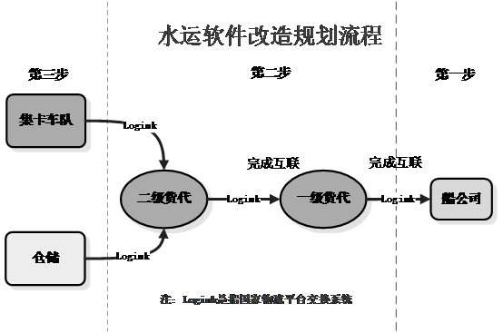 水運管理系統改造的推進,需遵循下游至上游企業的順序步驟。首先實現第一、二步:國際貨代軟件通過國家物流平臺的標準化改造,能夠對接大多數船公司的訂艙系統,為船公司帶來工作方便,并且船公司在船公司訂艙環節中具有強勢地位,所以從船公司入手打通一代到船公司的互聯環節比較容易實現,便于推廣,并且能讓一代適應信息化互聯應用。貨代間訂艙環節中,在一代適應信息化互聯應用的基礎上,一代具有這個環節中的強勢地位,并且能夠給一代帶來工作方便,提高了一代的工作效率,所以從一代入手打通二代到一代的互聯環節比較容易實現,便于推廣,并且能讓二代適應信息化互聯應用。