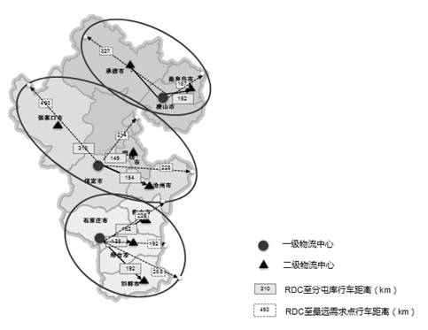 依托于全省倉儲布局優化后的方案,以充分發揮RDC庫的區域輻射功能為主要目的,重點提升配送的靈活性,按RDC輻射區域劃分配送范圍,作為一級物流中心的RDC庫重點負責其輻射范圍內物流中心的配送服務,構建RDC庫一體化配送模式。