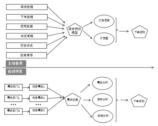 由專人負責定期向不同需求部門以“主動+被動”相結合的方式征集需求,1)根據物資歷史需求、庫存、領用等數據,主動預測需求,同時,根據需求部門提出的臨時性需求,被動下單;2)將需求根據物資類型進行整合、分析,結合現有庫存(含在途)的情況,以“以存供需”為原則,優先使用現有庫存進行下單。以保障在及時滿足需求的前提下,盤活庫存,提升倉儲利用率。