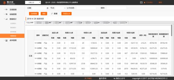 節點類公司大致分為港口、站臺及物流園區幾大節點,通過同步節點的數據,及時向貨主及運輸公司反應貨物出入庫情況等,使貨物位置可見,貨物狀態更明了,貨權清晰。同時,易焦煤平臺也為節點類公司提供了出入庫管理、堆場管理、數據統計、運輸管理、成本管理及客戶管理幾大功能模塊。