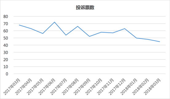 項(xiàng)目實(shí)施后,通過對(duì)人、車輛、貨物的監(jiān)控和時(shí)效的管控,不斷優(yōu)化現(xiàn)有流程,滿足客戶不斷增長的服務(wù)需求。 如:下圖為某物流公司17年3月到18年3月客戶投訴票數(shù)的變化趨勢(shì)。從圖中可以看出,該公司在2017年3月到12月的投訴票數(shù)居高不下,平均為60.9票左右。而在使用卡行時(shí)效管控平臺(tái)后,投訴票數(shù)下降到47.6票以下。