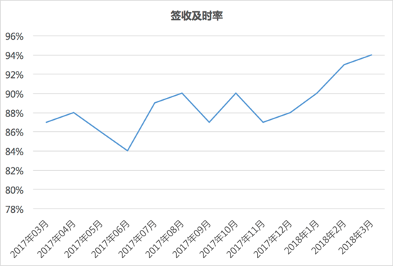 項(xiàng)目實(shí)施后,通過對(duì)運(yùn)輸鏈條的實(shí)時(shí)監(jiān)控,完善全程信息跟蹤系統(tǒng)與數(shù)據(jù)采集流程,做到信息當(dāng)天反饋、當(dāng)天分析,發(fā)現(xiàn)異常問題并及時(shí)解決。從而縮短貨物的交貨期,并在一定程度上提高了交貨準(zhǔn)時(shí)率。如:下圖為某物流公司17年到18年3月的貨物簽收及時(shí)率,17年平均每月簽收及時(shí)率是87%,自從18年加盟卡行后,經(jīng)過卡行標(biāo)準(zhǔn)化培訓(xùn)和系統(tǒng)使用,簽收及時(shí)提升到了92%。