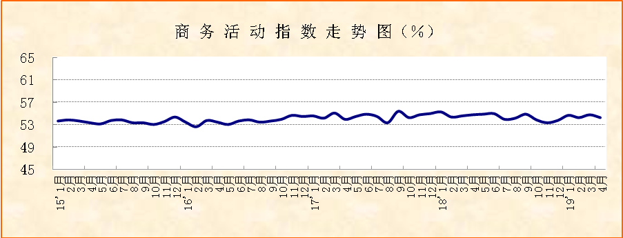 中國物流與采購聯合會、國家統計局服務業調查中心發布的2019年4月份中國非制造業商務活動指數雖較上月回落0.5個百分點,但仍達到54.3%,連續4個月穩定在54%以上;從業人員指數為48.7%,環比持平,持續7個月穩定在48%以上;業務活動預期指數穩定在60%以上;新訂單指數有所回落,環比下降1.7個百分點至50.8%,但仍高于2018年4季度平均水平。綜合指數變化,非制造業整體持續穩定運行趨勢未變,市場需求增速放緩。