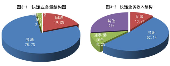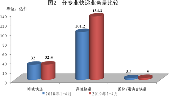 1-4月份,同城、異地、國際/港澳臺快遞業務量分別占全部快遞業務量的19%、78.7%和2.3%;業務收入分別占全部快遞收入的10.7%、52.1%和10.2%。與去年同期相比,同城快遞業務量的比重下降4.4個百分點,異地快遞業務量的比重上升4.7個百分點,國際/港澳臺業務量的比重下降0.3個百分點。