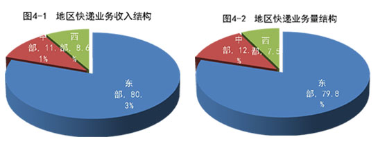 1-4月份,東、中、西部地區快遞業務量比重分別為79.8%、12.7%和7.5%,業務收入比重分別為80.3%、11.1%和8.6%。與去年同期相比,東部地區快遞業務量比重下降0.4個百分點, 快遞業務收入上升0.1個百分點;中部地區快遞業務量比重上升0.7個百分點, 快遞業務收入比重基本持平;西部地區快遞業務量比重下降0.3個百分點,快遞業務收入比重下降0.1個百分點。