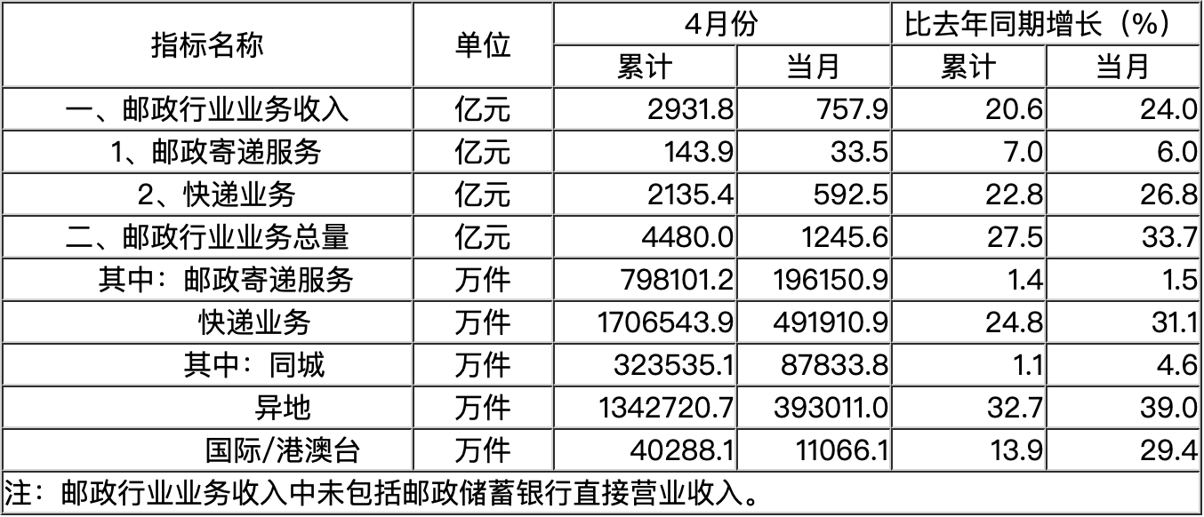 4月份,郵政服務業務總量完成187.7億元,同比增長16.5%;郵政寄遞服務業務量完成19.6億件,同比增長1.5%;郵政寄遞服務業務收入完成33.5億元,同比增長6%。