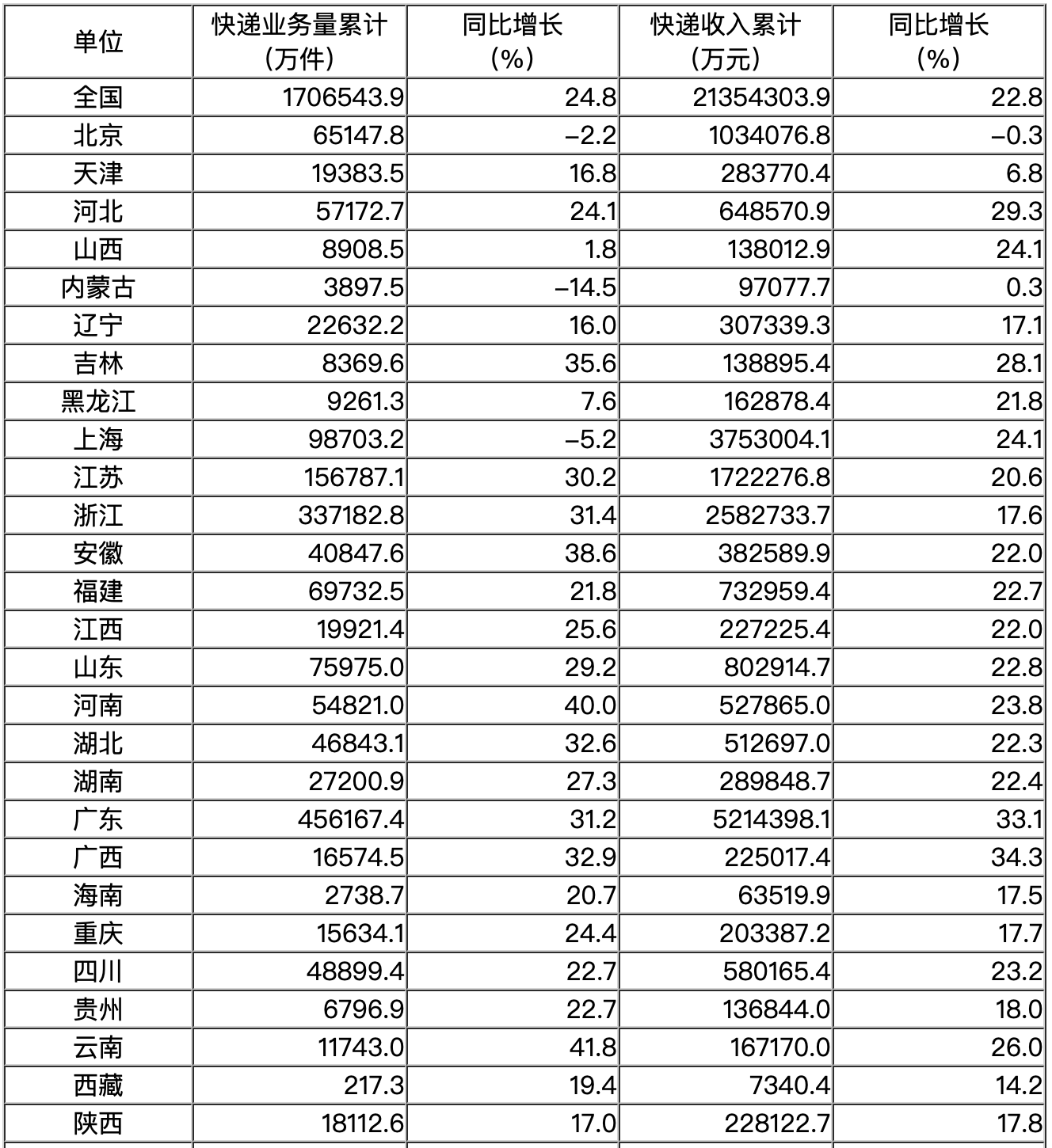 1-4月份,全國快遞服務企業業務量累計完成170.7億件,同比增長24.8%;業務收入累計完成2135.4億元,同比增長22.8%。其中,同城業務量累計完成32.4億件,同比增長1.1%;異地業務量累計完成134.3億件,同比增長32.7%;國際/港澳臺業務量累計完成4億件,同比增長13.9%。