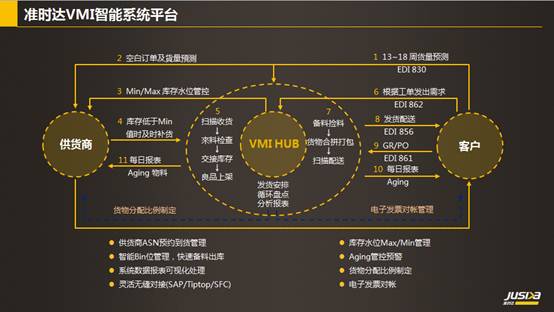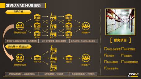 準(zhǔn)時(shí)達(dá)供應(yīng)鏈協(xié)同倉(cāng)(VMI HUB),適用于供應(yīng)商數(shù)量多,供貨頻次高,且生產(chǎn)規(guī)模大的制造商,如C客戶的制造商。各地供應(yīng)商按照生產(chǎn)預(yù)測(cè)將物料提前運(yùn)送至準(zhǔn)時(shí)達(dá)VMI HUB,由供應(yīng)商自己管理庫(kù)存,當(dāng)制造商需要生產(chǎn)用料時(shí),VMI HUB會(huì)依照生產(chǎn)要求把零配件按成品需求比例配置好,進(jìn)行JIT產(chǎn)前集拼出貨。上線前進(jìn)行物權(quán)交割,實(shí)現(xiàn)真正意義上的JIT供料模式。