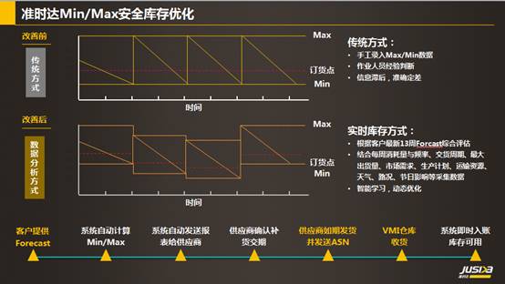 傳統(tǒng)的Min/Max庫(kù)存水位數(shù)據(jù)是人工計(jì)算,一成不變的,準(zhǔn)確性差,效果也不好。在準(zhǔn)時(shí)達(dá)的供應(yīng)鏈協(xié)同倉(cāng),我們依靠工業(yè)大數(shù)據(jù)的應(yīng)用,提前13周采集客戶的forecast,并定期結(jié)合每周消耗量與頻率、交貨周期、最大出貨量、市場(chǎng)需求、生產(chǎn)計(jì)劃、運(yùn)輸資源、天氣、路況、節(jié)日影響等采集數(shù)據(jù),動(dòng)態(tài)優(yōu)化。