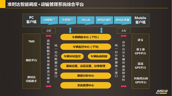 準(zhǔn)時(shí)達(dá)的智能調(diào)度+運(yùn)輸管理系統(tǒng)平臺(tái),開(kāi)放式地引入了市場(chǎng)上先進(jìn)的供應(yīng)鏈規(guī)劃和系統(tǒng)工具,并對(duì)其進(jìn)行充分的數(shù)據(jù)集成。通過(guò)PC和Mobile客戶端,為客戶提供便捷的可視化查詢工具。