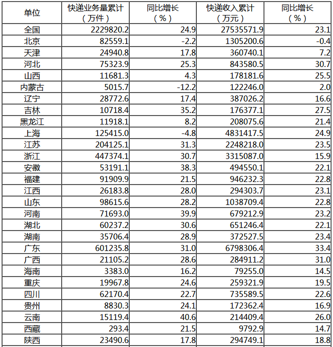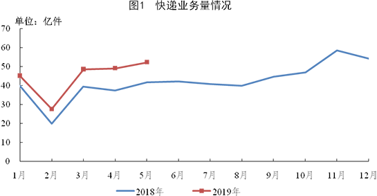 5月份,全國快遞服務企業業務量完成52.3億件,同比增長25.2%;業務收入完成618.1億元,同比增長24.2%。