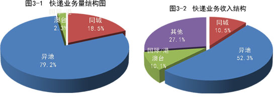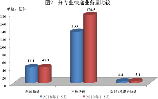 1-5月份,同城、異地、國際/港澳臺快遞業務量分別占全部快遞業務量的18.5%、79.2%和2.3%;業務收入分別占全部快遞收入的10.5%、52.3%和10.1%。與去年同期相比,同城快遞業務量的比重下降4.5個百分點,異地快遞業務量的比重上升4.7個百分點,國際/港澳臺業務量的比重下降0.2個百分點。
