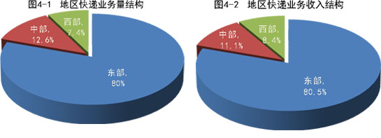 1-5月份,東、中、西部地區快遞業務量比重分別為80%、12.6%和7.4%,業務收入比重分別為80.5%、11.1%和8.4%。與去年同期相比,東部地區快遞業務量比重下降0.4個百分點, 快遞業務收入上升0.2個百分點;中部地區快遞業務量比重上升0.6個百分點, 快遞業務收入比重基本持平;西部地區快遞業務量比重下降0.2個百分點,快遞業務收入比重下降0.2個百分點。