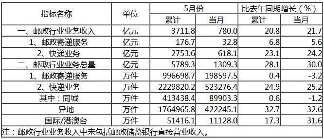 5月份,郵政服務業務總量完成189.3億元,同比增長17.8%;郵政寄遞服務業務量完成19.9億件,同比下降3.2%;郵政寄遞服務業務收入完成32.8億元,同比增長5.6%。