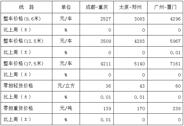 分車型看,各車型指數總體平穩,與上周相比略微回升。其中,整車指數為984點;比上周回升0.01%;零擔重貨指數為983.64點,比上周回升0.02%;零擔輕貨指數為968.36點,比上周回升0.02%。