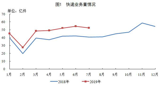 7月份,全國快遞服務企業(yè)業(yè)務量完成52.5億件,同比增長28.6%;業(yè)務收入完成608.4億元,同比增長26.3%。