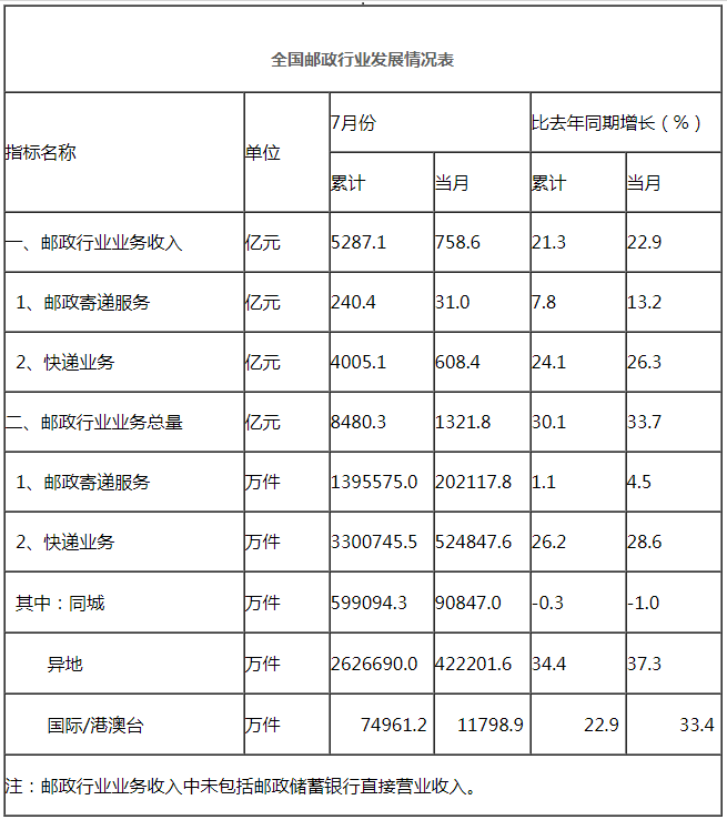 7月份,全行業(yè)業(yè)務收入完成758.6億元,同比增長22.9%;業(yè)務總量完成1321.8億元,同比增長33.7%。