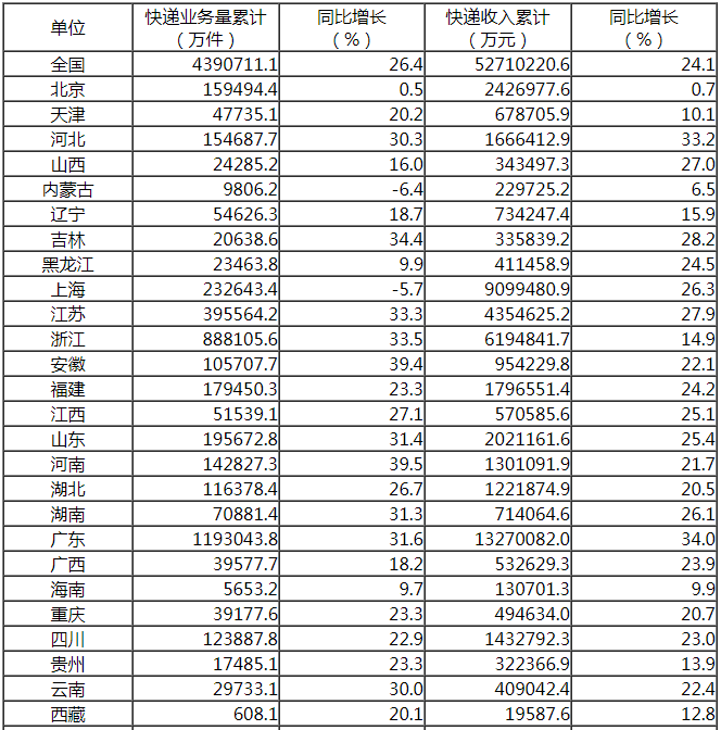 9月份,全行業業務收入完成822.7億元,同比增長19.9%;業務總量完成1419.4億元,同比增長33.3%。