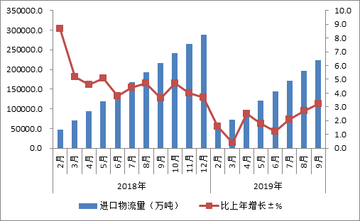 進(jìn)口物流量增速小幅回暖。前三季度進(jìn)口物流量同比增長(zhǎng)3.2%,增速比上半年提高2個(gè)百分點(diǎn)。受到中美經(jīng)貿(mào)摩擦的不確定性影響,今年以來(lái)國(guó)際物流需求波動(dòng)頻繁。進(jìn)入9月,在內(nèi)需等相關(guān)因素帶動(dòng)下,大宗商品進(jìn)口需求仍處于高位,同時(shí)消費(fèi)品進(jìn)口也保持快速增長(zhǎng)。不同貨類(lèi)看,原油、煤等大宗商品進(jìn)口量增加,水果、化妝品、水海產(chǎn)品和豬肉等消費(fèi)品進(jìn)口量幅度較大。前三季度,原油比上年同期增長(zhǎng)9.7%;煤比上年同期增長(zhǎng)9.5%;消費(fèi)品比上年同期進(jìn)口增長(zhǎng)15.3%,其中進(jìn)口豬肉增長(zhǎng)43.6%;進(jìn)口牛肉增長(zhǎng)53.4%。
