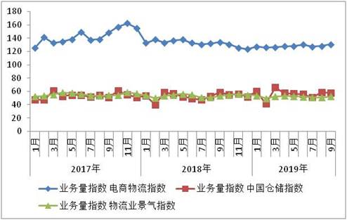 圖 3 物流業(yè)景氣指數(shù)、中國(guó)倉(cāng)儲(chǔ)指數(shù)、電商物流指數(shù)業(yè)務(wù)量指數(shù)走勢(shì)