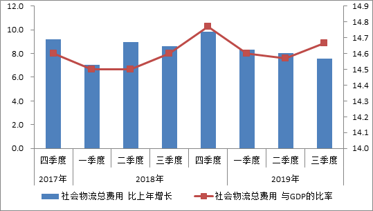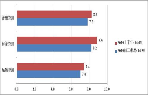 前三季度,社會(huì)物流總費(fèi)用與GDP的比率為14.7%,盡管比2018年全年回落0.1個(gè)百分點(diǎn),但比上年同期、今年上半年均提高0.1個(gè)百分點(diǎn)。2017年之前,這一比率連續(xù)5年下降,2018-2019年出現(xiàn)反復(fù),這不改變?cè)诋a(chǎn)業(yè)、經(jīng)濟(jì)、政策等綜合作用下物流效率改善的基本趨勢(shì),但從近期情況看,物流成本水平的上升與物流運(yùn)行的微觀環(huán)境惡化及經(jīng)濟(jì)運(yùn)行過(guò)程中保管環(huán)節(jié)成本提高有較大關(guān)系。