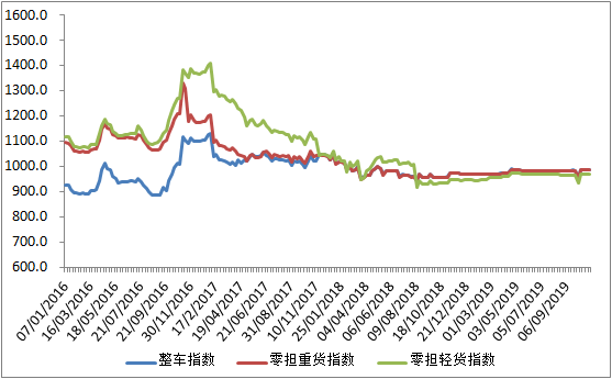 分車型看,各車型指數(shù)環(huán)比均有不同程度回落。其中,整車指數(shù)為987.00點,比上周回落0.04%;零擔重貨指數(shù)為986.24點,比上周回落0.04%;零擔輕貨指數(shù)為967.95點,比上周回落0.03%。