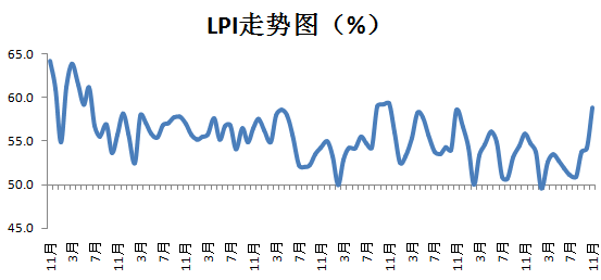 業(yè)務(wù)總量指數(shù)回升,需求保持旺盛。11月份,業(yè)務(wù)總量指數(shù)回升4.7個百分點,為58.9%。運輸業(yè)、倉儲業(yè)和郵政業(yè)均保持快速增長,顯示出受電商活動影響,需求旺盛,物流業(yè)務(wù)活躍。
